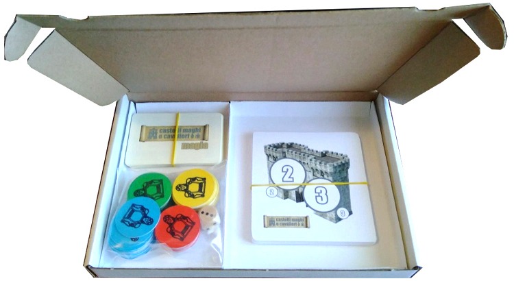Invece in "Castelli maghi e cavalieri" il tabellone "tradizionale" non esiste più ma si compone di una serie di carte castello da disporre a piacere. Inoltre sono anche scomparsi gli eserciti rappresentati da carte (ricordo che c'erano di varie "pezzature" oltre a principi, principesse e relative regole "cavalleresche" da rispettare) qui sostituiti da gettoni, mentre i maghi hanno lasciato posto alle sole magie.