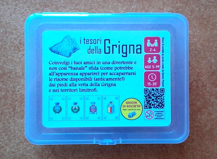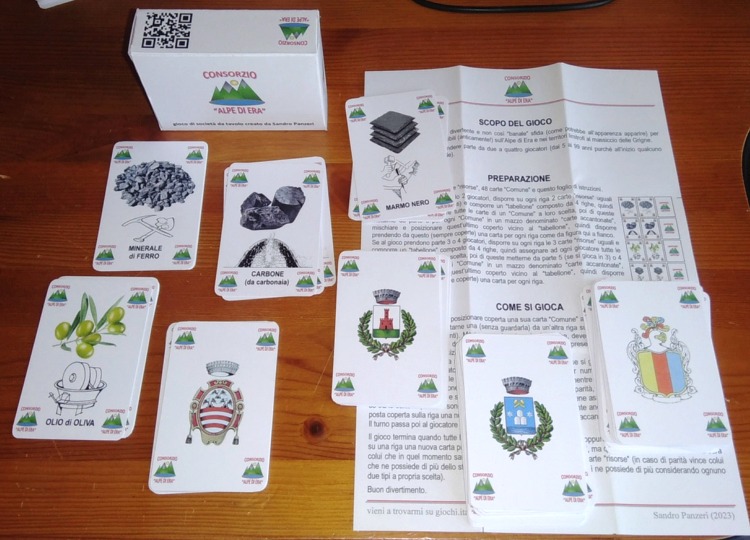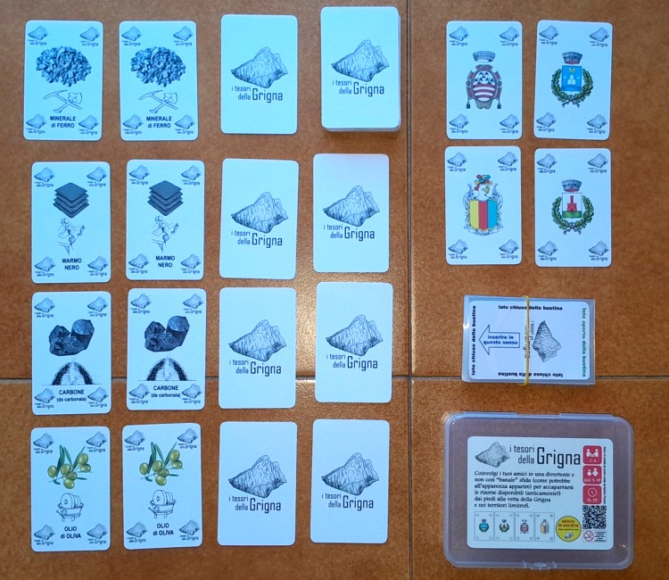 Ma, onestamente (e immodestamente parlando), mi spiaceva lasciarlo nei progetti "in sospeso" e così, dopo averne derivato esattamente un anno dopo in una copia unica il gioco "iiih" (ambientato nel mondo dei cavalli e spedito tradotto in Polonia), ecco che il 20 marzo 2026 lo ho trasformato (mantenendo quasi inalterate le figure originali delle carte) in questo "i tesori della Grigna", visto che lo stesso Matteo Poletti segnala nel suo libro che fino all'inizio del secolo scorso la montagna Grigna (e soprattutto il fondovalle antistante verso il lago) è stato spesso "fonte di vita" (e per questo io parlo di "tesori") per la popolazione Mandellese e dei Comuni limitrofi, mentre in passato (molto in passato) era stato territorio conteso per le risorse di cui disponeva (non a caso i giocatori interpretano Comuni che nel tempo si sono susseguiti nello sfruttamento di quanto quel territorio offriva), mentre ora la Grigna è più legata al solo turismo.